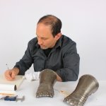 Recently, Eyal Azerad, the owner of Darksword Armory, took a first-hand examination of an authentic pair of 16th century German Gauntlets. The Gauntlets are dated from 1580-1590’s. Made of Iron. Rolled and roped edge cuffs, five slightly tapered and embossed metacarpal plates and shaped knuckle plates. Finely etched with continuous floral design on the central band and upper borders. These present one of the nicest pair of Gauntlets we have inspected in the last couple of years.