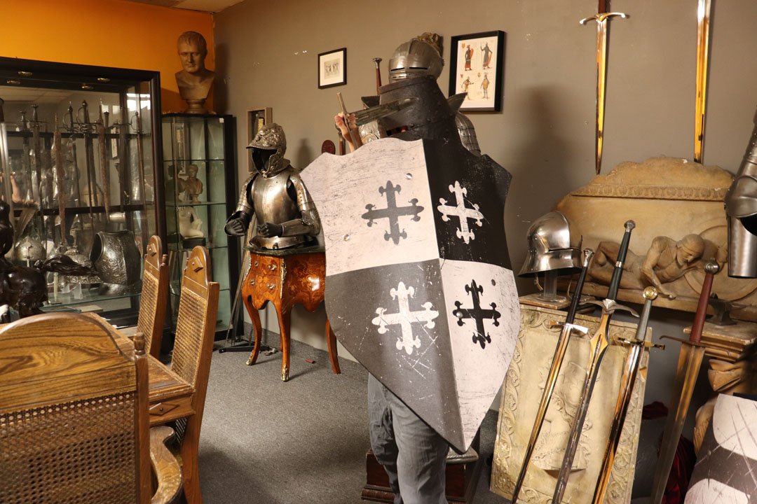 As thess were conflicts supported and directed by the Christian church, many who participated considered it to be a holy calling to join in the fray. As a result, the symbolism chosen by the Crusaders often trended towards Christian or biblical symbolism. Multiple versions of the Christian cross, for instance, were developed with different artistic flares and cultural implications. One of these crosses was the Jerusalem Cross, in which four crosses are placed in quadrants around a larger cross shape. Occasionally, the crosses that make up the Jerusalem Cross may be in the stylized form known as the cross potent, or crutch cross- simply put, crosses with equal lengths all round, and with bars at the ends of each arm. This Crusaders Shield is designed with the Jerusalem cross as it’s inspiration. Four stylized crutch crosses are depicted in alternating black and white quadrants, dividing the shield in four around the central focal point. This would have been a design recognizable on the battlefield as belonging to a Crusader, and while those times are thankfully long past we hope you can appreciate the artistry that went into the design.