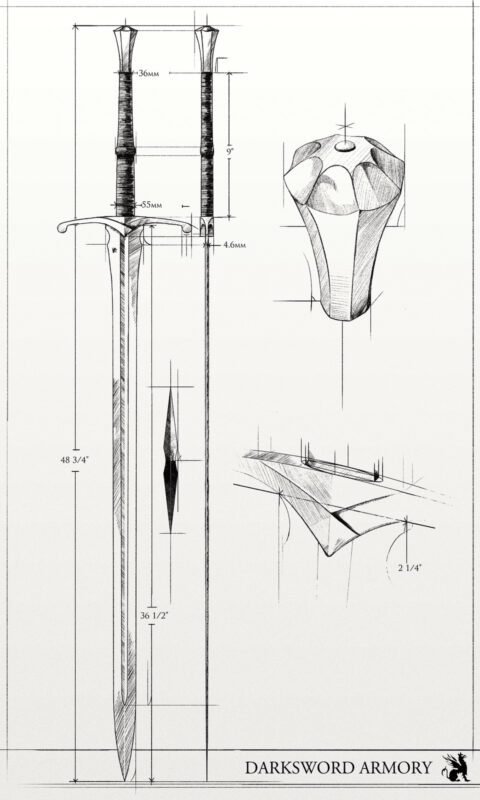 Despite the grim origins of the name, the Darksword Armory Fëanor sword is a bright and beautiful weapon. A long, leaf-shaped blade shows the Celtic influence incorporated into Tolkien’s elves, and when sharpened the blade rings with each cut as a sign of its solid construction. The attractive lines of the sweeping guard are perfectly proportioned to the blade, and the scent-stopper pommel provides the necessary balance to make this two-handed sword nimble in the hands. The 5160 blade is resilient and well-tempered, able to withstand the rigors of combat – even combat against the forces of Melkor. Constructed as a two-handed longsword, many European styles of swordplay would be appropriate with this weapon.