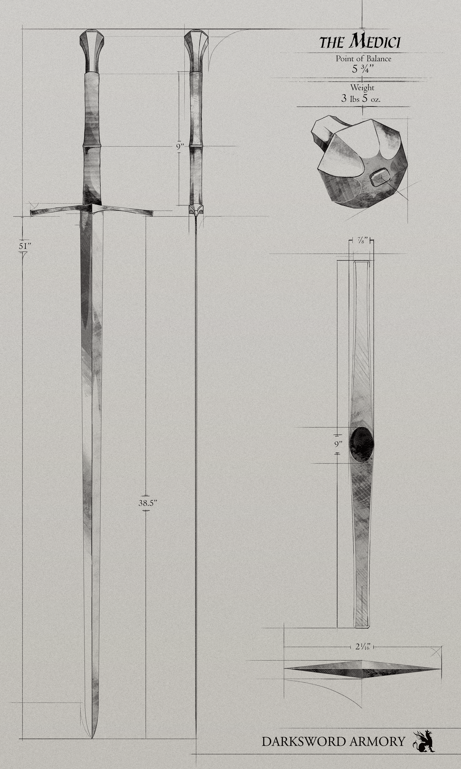 Inspired by the Italian greatswords of the 16th century, the  Medici, type XVIIIb, Two-Handed Sword is a surprisingly elegant and nimble design. The long, slender blade is rendered a strong thrusting weapon due to the diamond cross-section, allowing it to slip between plates of armor and split rings of mail. Yet the reasonable point-of-balance and extended, leather-wrapped handle create a weapon that flows smoothly through guard, cut, and thrust, not limiting it to a single style of offence. The gracefully curved guard and scentstopper pommel complement the simple and straightforward blade, and everything is polished to a mirror sheen. The Medici, named for the Italian political dynasty that were for a time the de facto rulers of Italy, is a beautiful weapon that deserves to be a centrepiece in your home.