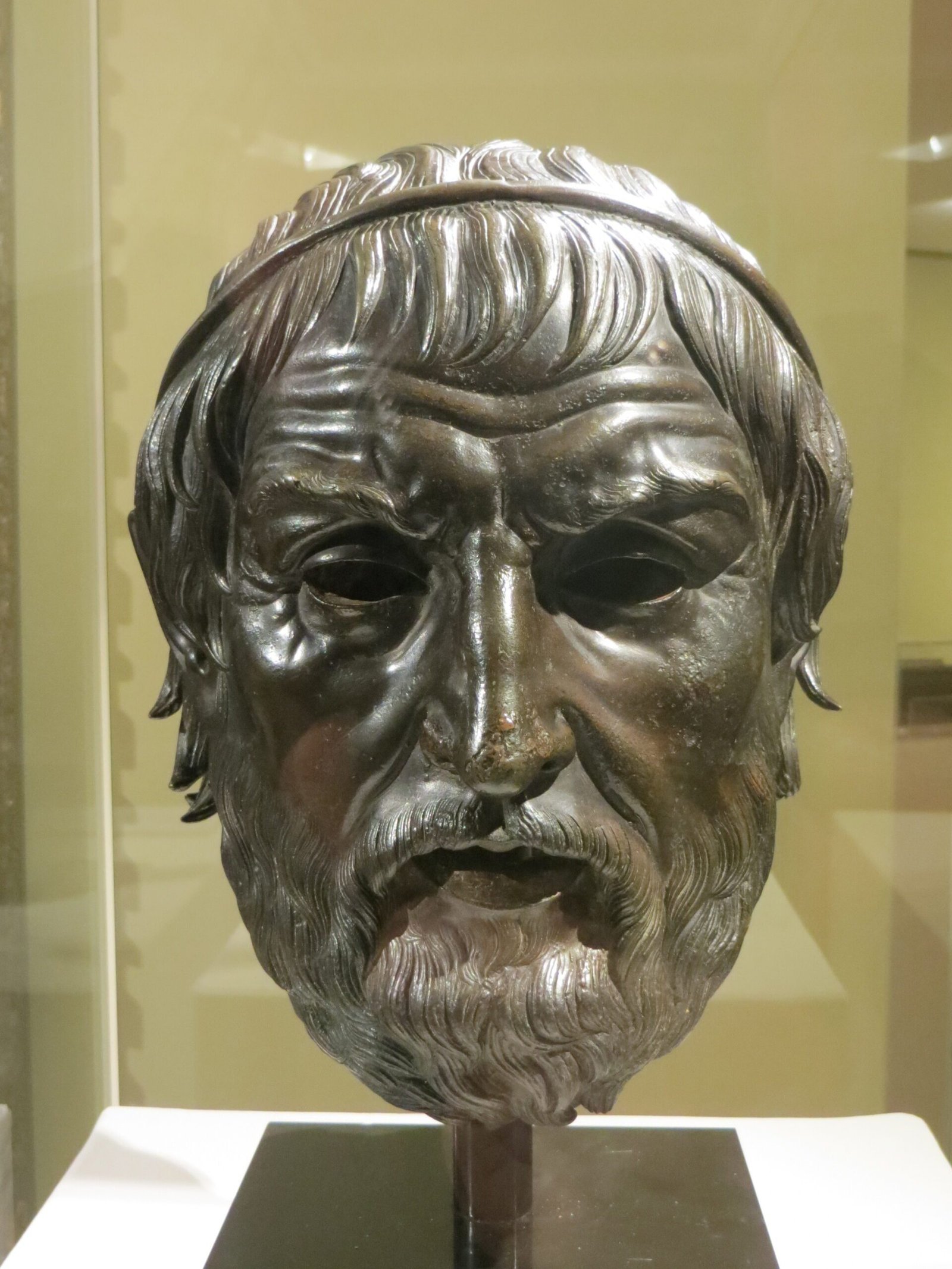 The head is all that remains of a life-size bronze statue. The artist has realistically conveyed the worn features of an old man, including a wrinkled forehead, almond-shaped eyes and pouting mouth, which gives the portrait an air of power and authority. The hair of this bronze masterpiece is tied down in a ribbon, which suggests it may have portrayed a poet. Once thought to represent the ancient Greek writer Homer , it is currently considered to personify either the ancient Greek playwright Sophocles or Macedonian King.